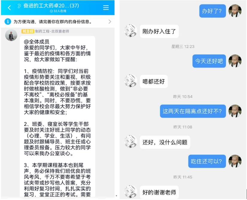 辅导员和班主任及时传达每一条防疫信息,确保每一条重要消息通知到位,日复一日督促健康打卡,提醒大家完成核酸检测,给大家暖心小贴士,关心隔离员工情况,认真落实每位同学的健康状况。