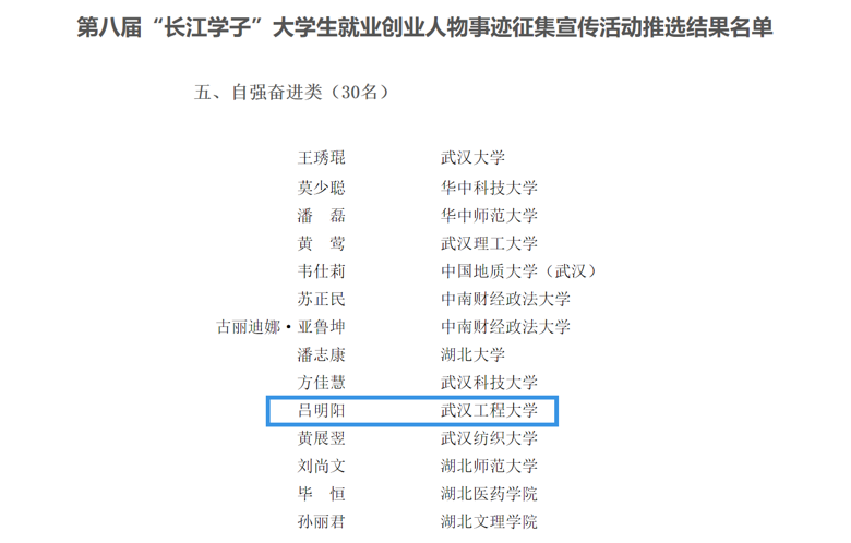 本网讯(通讯员 沈霁月)近日,湖北省教育厅第八届“长江学子”老员工就业创业人物事迹征集活动结果公布,全省共有150名老员工入选,公司2018级智能化工01班吕明阳同学从众多参选者中脱颖而出,入选自强奋进类“长江学子”荣誉称号。