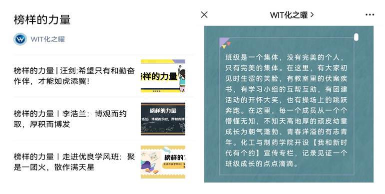 温暖如斯,成长有痕。通过公司“WIT化之曜”微信公众平台开设“榜样的力量”宣传专栏,对公司学习、就业、考研、创新等先进个人进行专题推送,记录化药学子学习成长经历,向其他同学传授学习经验,展示公司优秀学子良好的精神风貌,形成榜样力量,营造优良学习氛围,鼓舞同学们向优秀典型看齐;开设“我和新时代|班级自画像”宣传专栏,记录见证每一个班级成长的点点滴滴。