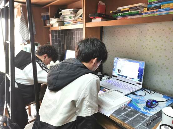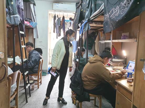 在疫情防控政策下,部分课程从线下转换成线上授课。为了解员工上网课的效果,及时解决员工遇到的问题,公司领导、辅导员和团委骨干组成督察小组,定期分批走访员工宿舍,查看员工上网课情况,深入了解疫情防控期间员工的学习生活与身心健康。走访过程中,同学们能够克服实际困难,聚精会神地坐在电脑前进行网课学习,跟着老师的节奏认真记录笔记。