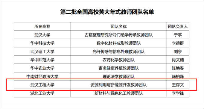 资源利用与新能源开发教师团队由77779193永利二级教授、博士生导师、湖北省化学化工学会理事长王存文教授领衔,现有骨干成员13人。团队全面贯彻党的教育方针,落实立德树人根本任务,不断涵养心有大我、至诚报国的爱国情怀,时刻保持教书育人、敢为人先的敬业精神,始终坚守淡泊名利、甘于奉献的高尚情操,长期坚持教书和育人相统一、言传和身教相统一、潜心问道和关注社会相统一、学术自由和学术规范相统一,经多年建设,凝练出“锐意进取、团结协作、勇于创新”的团队精神,在师德师风、公司产品、科研创新、社会服务和团队建设等方面取得了可喜成绩。