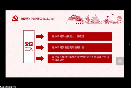 爱国主义是中华民族的民族心、民族魂,是中华民族最重要的精神财富,每一位青年学子都应当牢固树立爱党、爱国、爱人民的思想,涵养家国情怀。与会的师生党员在石大化工公司赵旭同学的带领下,共同学习了《新时代爱国主义教育实施纲要》的主要内容。