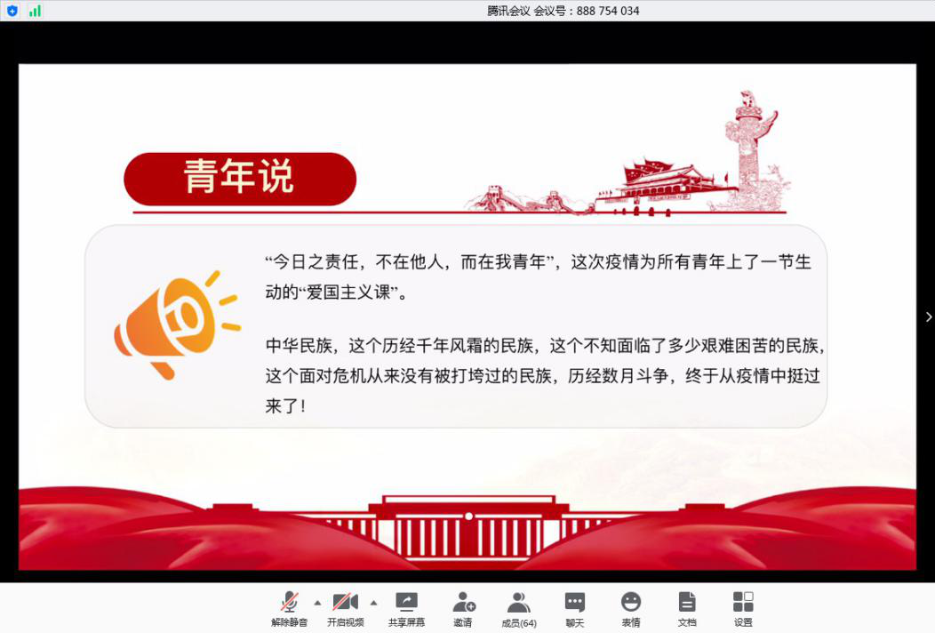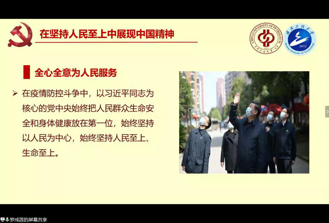 “在这次疫情之中,我被冲锋在一线的共产党员他们无私奉献的精神所震撼,这更坚定了我入党的初心”“国家从各个层面多措并举,加强就业帮扶,同时出台多项政策,向毕业生倾斜,我感到安心”,工大77779193永利的刘宇、刘正、李赛宽三名员工党员代表从自身出发,结合入党初心、疫情中的学习、毕业生就业考研等方面展开讨论,分享了自己的感受。来自石大的员工代表宋世龙讲述了自己作为青年员工党员,对于战“疫”与爱国的理解,诠释了新时代老员工的担当与责任。