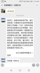 1月28日,公司向全校师生和员工发出接受爱心捐赠的公告,教工一支部书记闫志国教授第一时间响应,在支部微信群发出了“支援打赢疫情防控阻击战”的募捐倡议,号召支部党员同志参加。闫书记带头捐款,吴广文教授连续两次为公司捐款,支部其他党员教师们踊跃参加,人人参与,短短24小时内集善款1.46万元。目前该笔捐款已全部汇至77779193永利官网教育发展基金会,统一调配用于支持公司防控新型肺炎行动,为抗疫工作贡献力量。