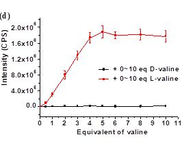 古双喜/朱园园博士团队与美国弗吉尼亚大学Lin Pu教授一起合作,设计合成了多个结构全新的手性分子探针,并发现其中一个分子探针对多种手性氨基酸均有史无前例的高识别能力,它将对映选择性荧光增强比(ef值)这一关键指标提高了一个数量级。该荧光探针能用于结构多样的手性氨基酸的光学纯度测定。